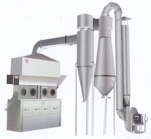 沸騰干燥機(jī),又稱流化床,它是由空氣過濾器、加熱器、沸騰床主機(jī)、旋風(fēng)分離器、布袋除塵器、高壓離心風(fēng)機(jī)、操作臺組成,由于干燥物料的性質(zhì)不同,配套除塵設(shè)備時,可按需要考慮,可同時選擇旋風(fēng)分離器,布袋除塵器,也可選擇其中一種,一般來說比重較大的如沖劑及顆粒物料干燥只需選擇旋風(fēng)分離器,比重較輕的小顆粒狀和粉狀物料需配套布袋除塵器,并備有氣力送料裝置及皮帶輸送機(jī)供選擇。